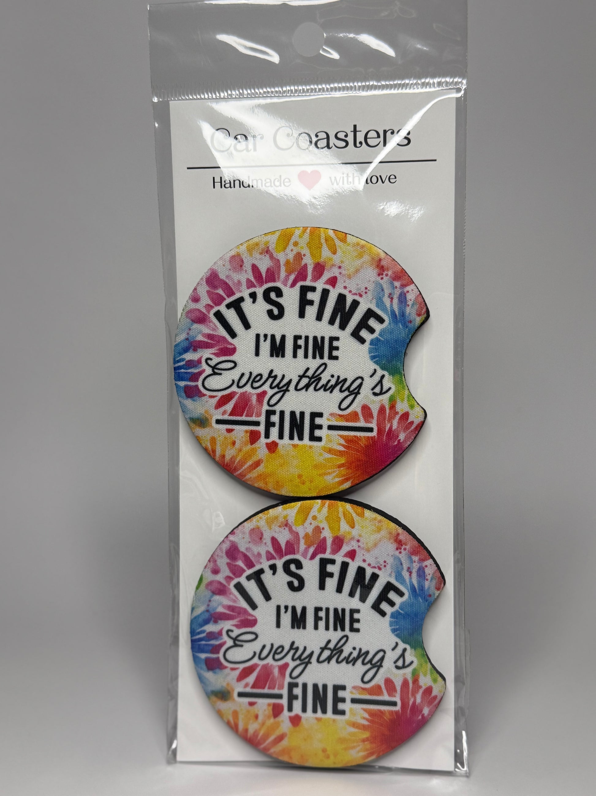 This "It's Fine, I'm Fine" car coaster set is perfect for keeping your car clean and stylish. With its cheeky phrase, it's a must-have for any car enthusiast. Say goodbye to messy cup holder spills and hello to a worry-free ride. Made with quality in mind, this set is a great addition to any car.