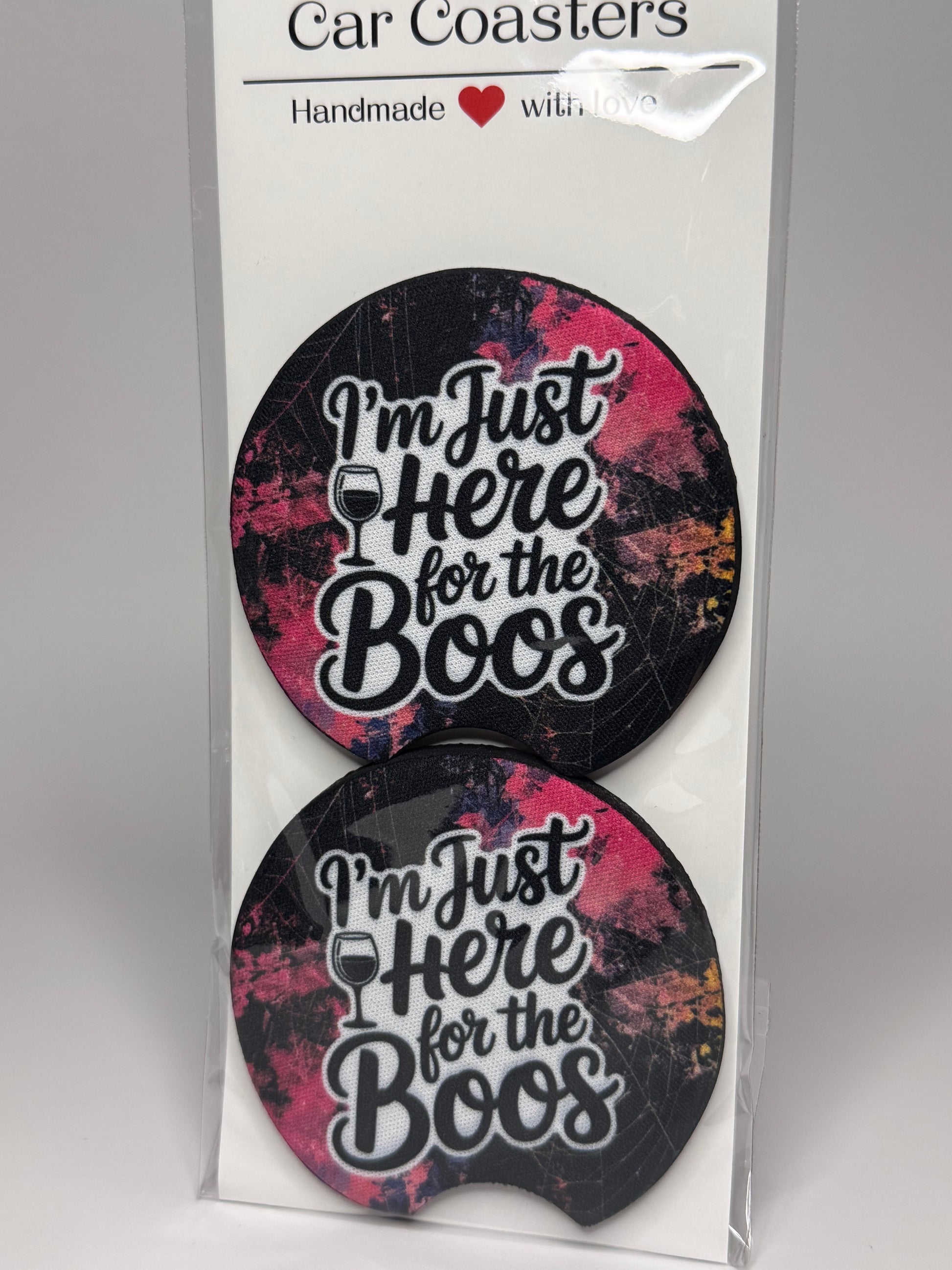 Get into the spooky spirit with our "I'm Just Here For The Boos" Halloween car coaster set. With its playful quote and quirky design, this set is perfect for any car or party. Keep your drinks from spilling and let everyone know you're only here for the boos!