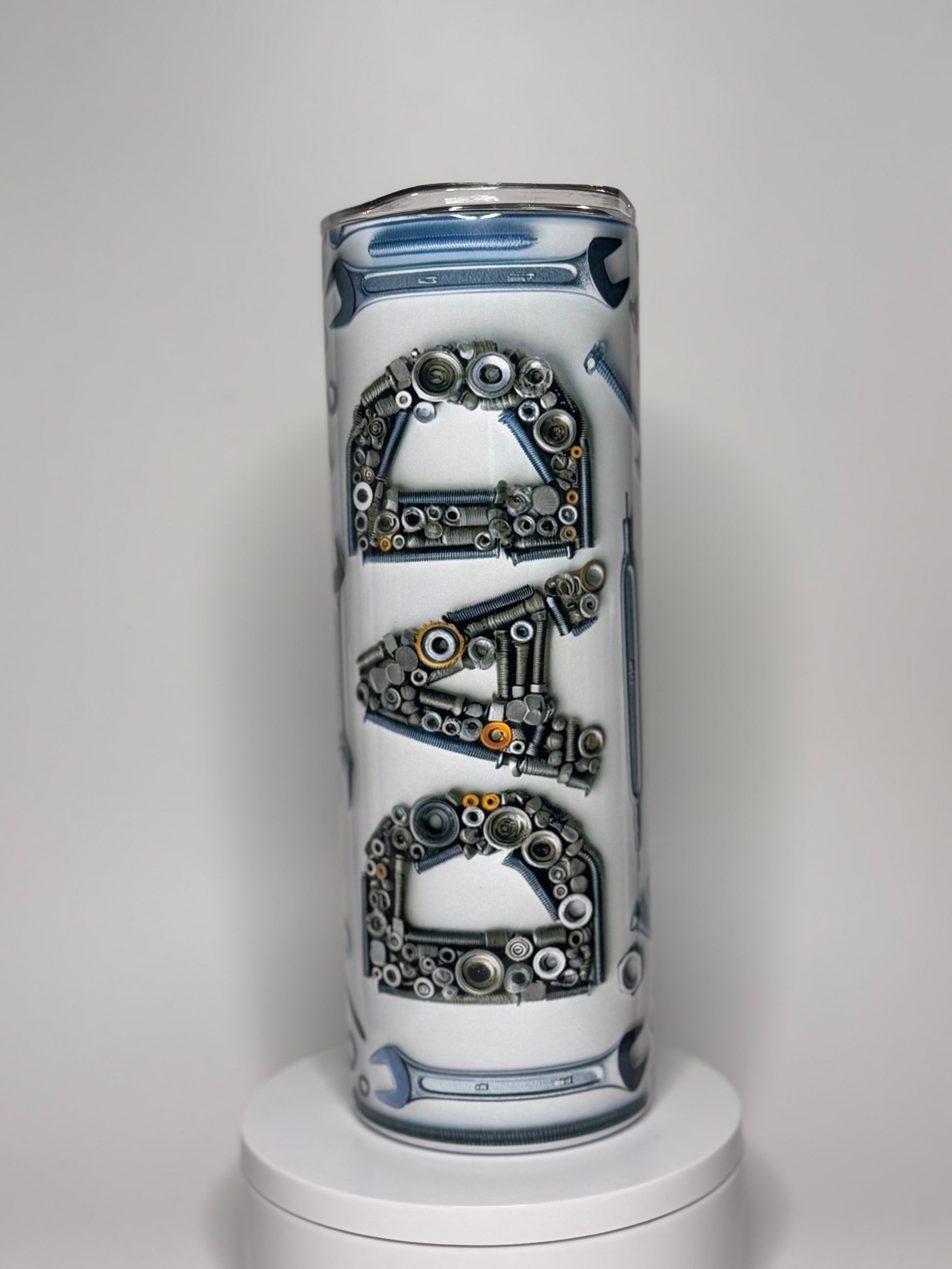 Introducing the "Dad" 20oz Tumbler, a stainless steel tumbler designed with dads in mind. With a 20 ounce capacity and included straw, this tumbler is perfect for any mechanic dad on-the-go. Keep their favorite drink at the perfect temperature while they work or relax. Durable and functional, just like any great dad.