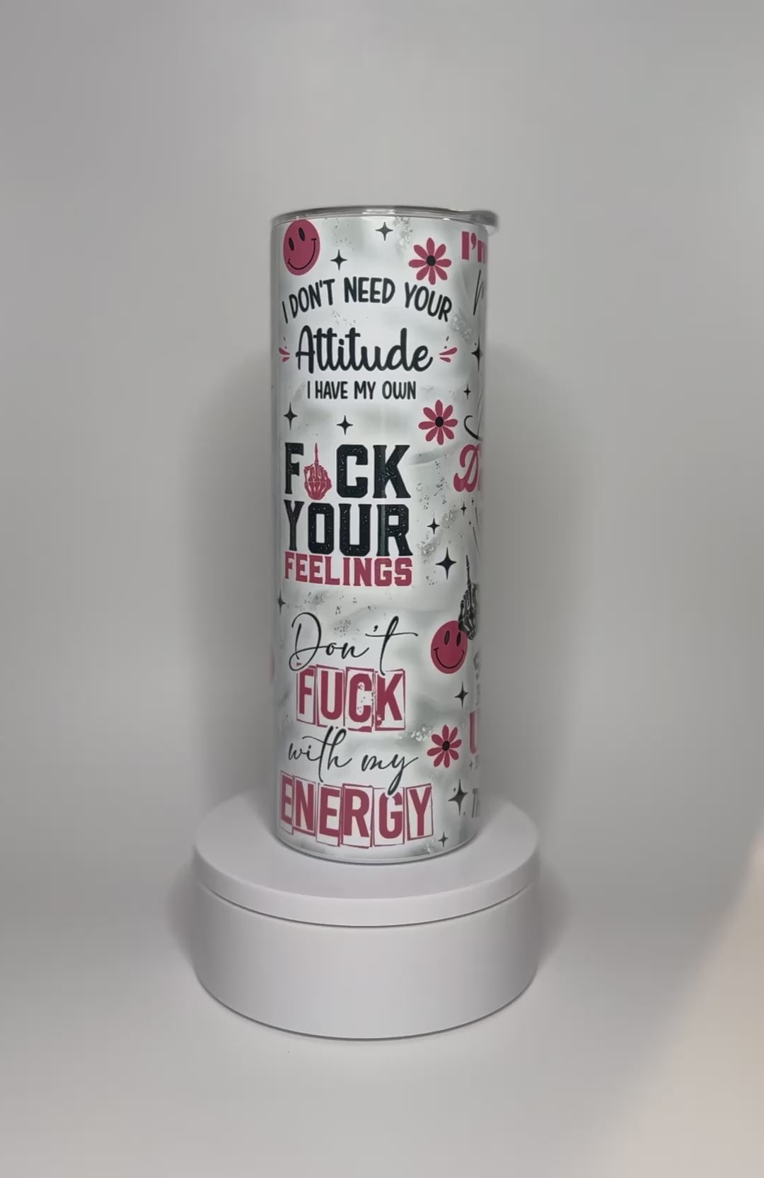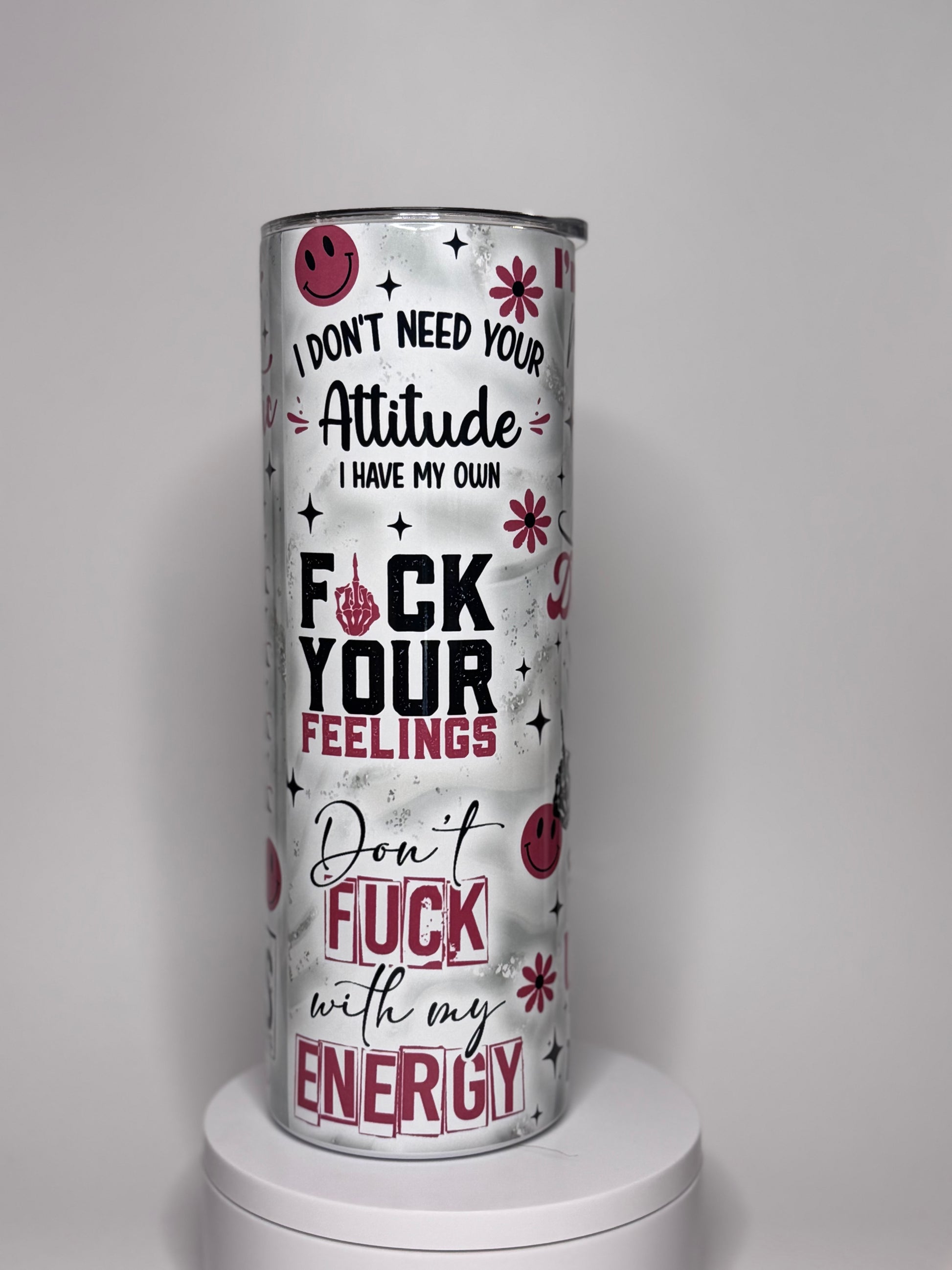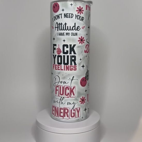The F*CK Your Feelings 20oz Tumbler is perfect for those looking to add a bit of boldness to their daily routine. Made with durable stainless steel, this tumbler holds 20 ounces and comes with a straw for convenience. The "F your feelings" design and savage quotes make for a confident and unapologetic statement.